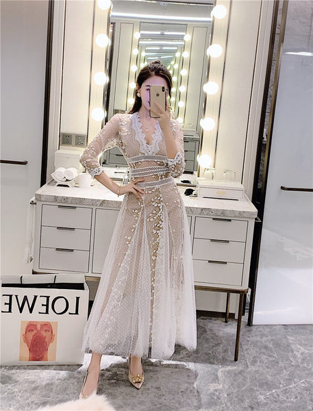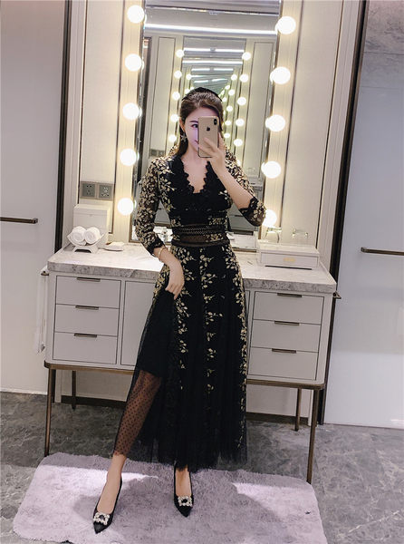 Heavy embroidery polka dot mesh dress for women spring and autumn ladylike temperament super fairy long version dress party dress skirt