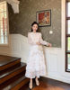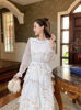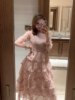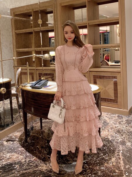 Long-sleeve, fuchsia cute long dress for princess, french style, bright catchy style, fitted, high waist, mid length