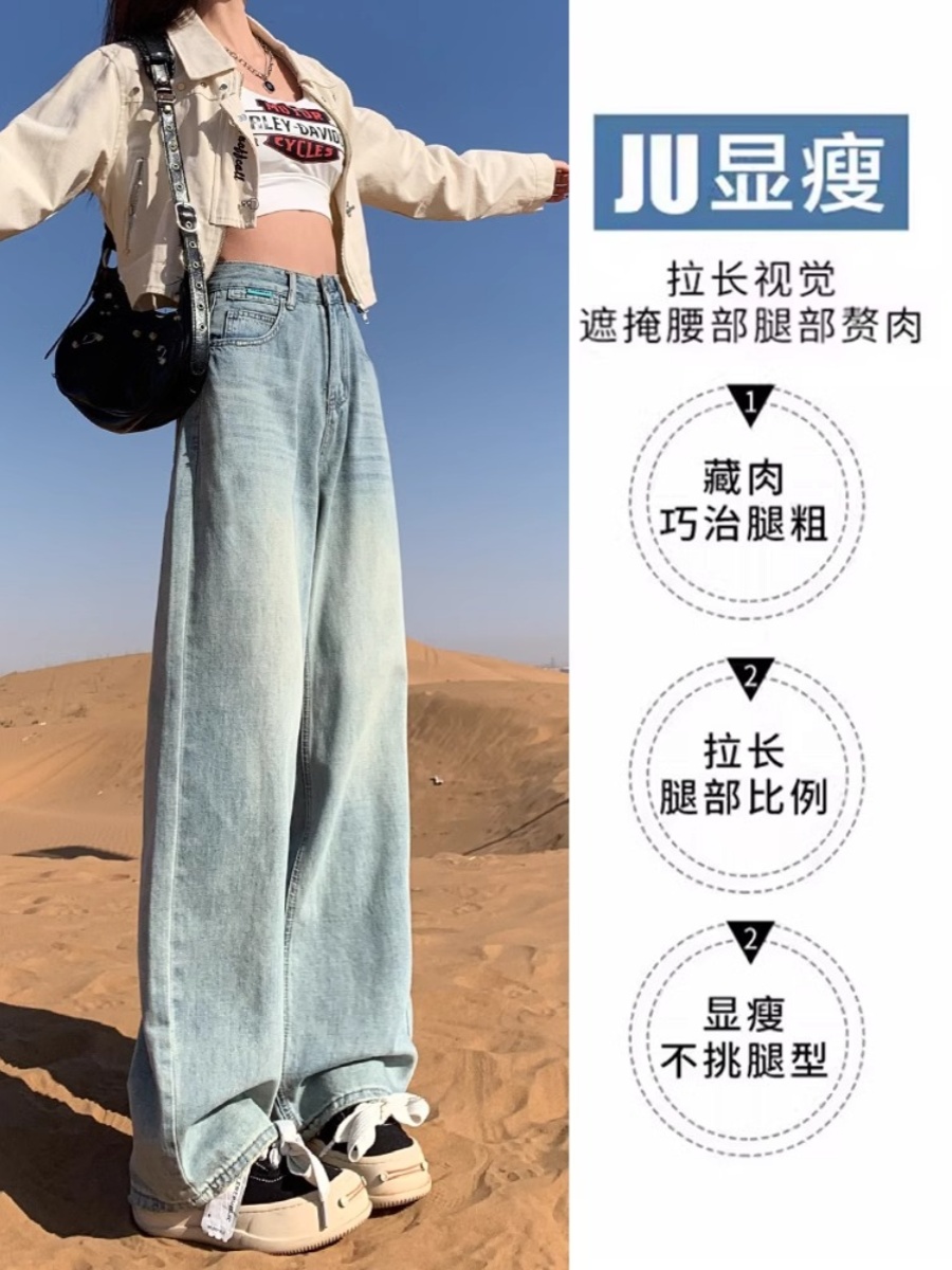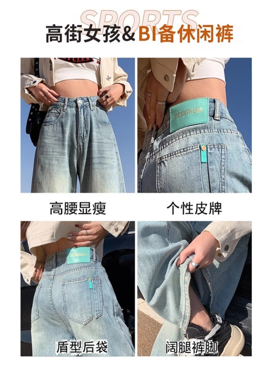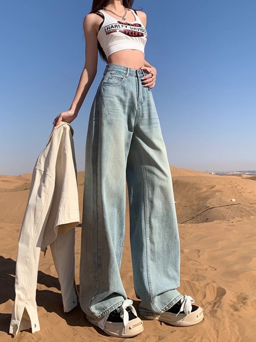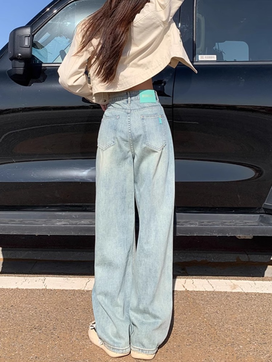 Light jeans, autumn design trousers, high waist, loose straight fit, for pear shaped body, trend of season