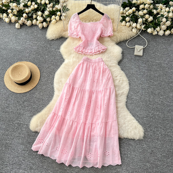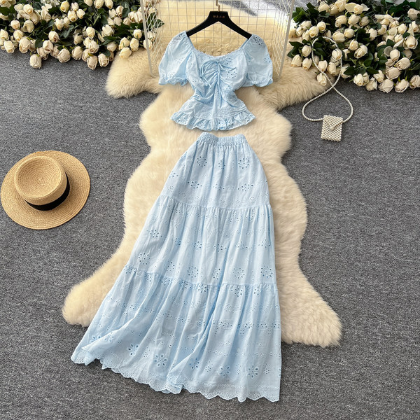 Brace, shirt, skirt, set, french style, square neckline, puff sleeves, high waist, with embroidery
