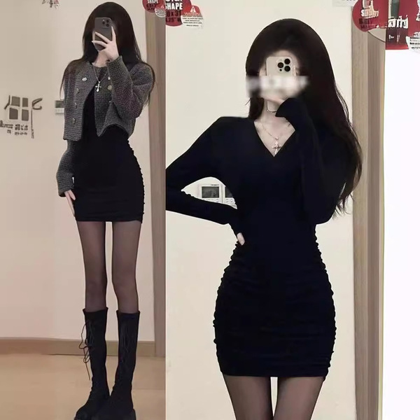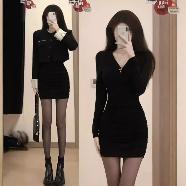 Knitted demi-season dress, skirt, mini-skirt, french style, hip-accented, tight