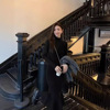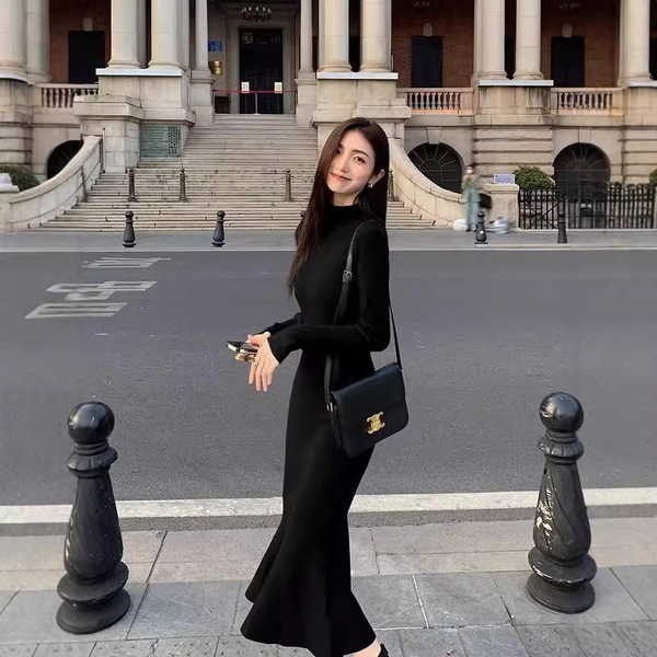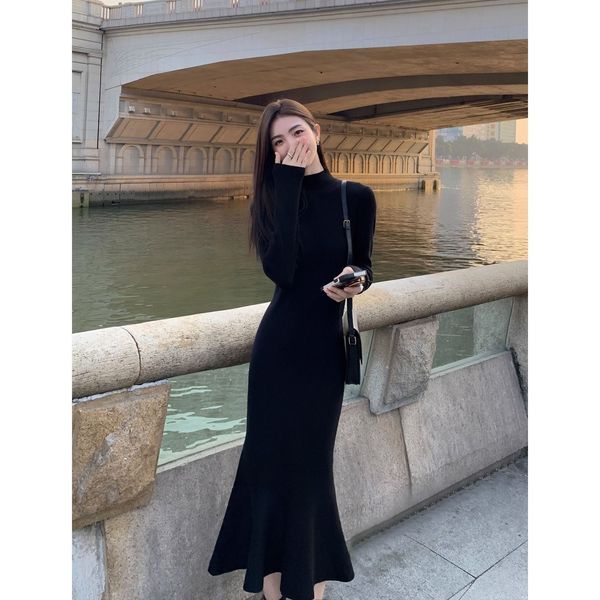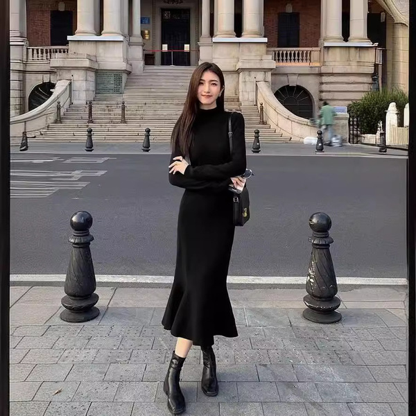Black demi-season dress, winter long skirt, "fish tail" cut, fish tail, high collar, fitted
