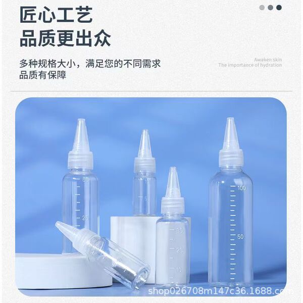 Transparent plastic bottle scaled, 10 ml, 20 ml, 30 ml, 50 ml, 100 ml