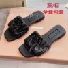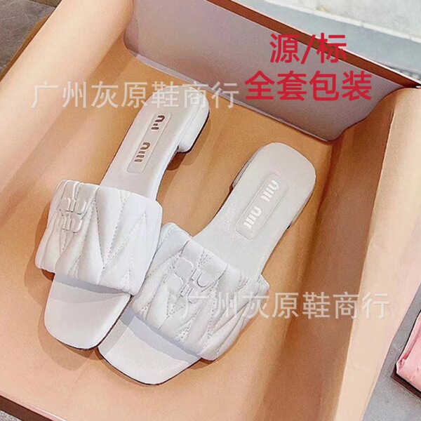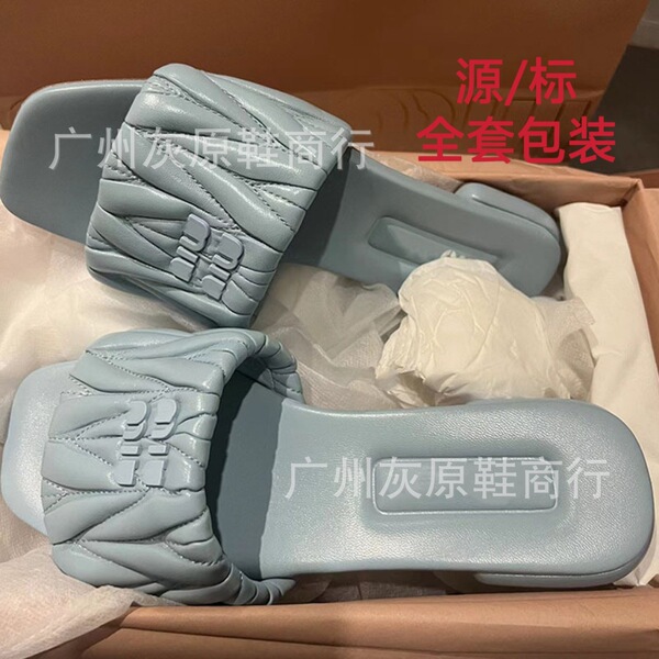 Miu slippers for women, summer outer wear for girls, pleated flat soles, non-slip vacation, Sanya square head sandals, foreign trade women