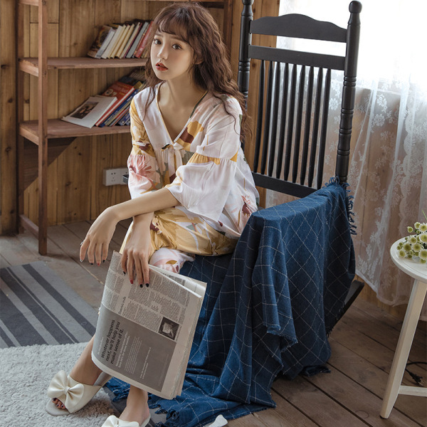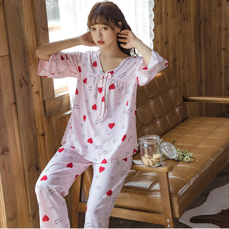 Summer pijama, trousers, thin set with bow, V-neckline, Korean style