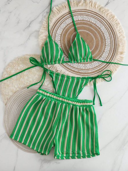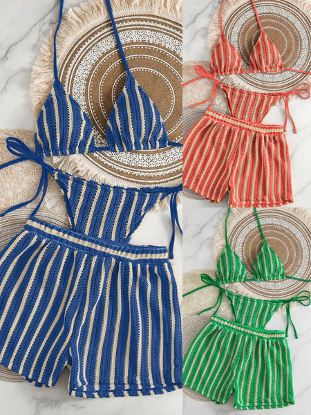 Knitted split trousers, sexy woven swimwear, set, (Cross-border trading), boho style, 3 piece set