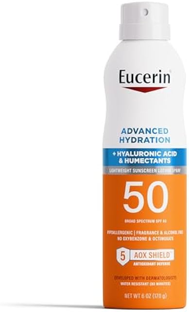 Eucerin Advanced Hydration SPF 50 Sunscreen Spray, Lightweight Spray Sunscreen with Hyaluronic Acid and Humectants, Hypoallergenic, Fragrance and Alcohol Free, 6 Oz Bottle